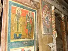 Biserica nu are urme de pictură murală. Icoanele au fost luate din biserică, din tâmplă mai rămânând Răstignirea și moleniile, o friză cu prooroci, benzile separatoare, decorate printr-un tor profilat și pictate cu flori. Se alătură acestora ușile diaconești (cu câte un arhanghel) și ușile împărătești, Buna Vestire, în decor arhitectural, cu medalioanele proorocilor Solomon și David[6]. Zugravul ar putea fi diaconul Zamfir de la Bălești, care a pictat în mai multe sate din zonă[7].