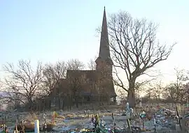 Biserica avea pereții din ramuri mari și groase din salcie, petrecute ca o împletitură între stâlpii de lemn. Acestora li s-a aplicat, in interior și exterior, straturi de pământ înmuiat și ulterior întărit. Până târziu, după 1900, s-a păstrat cheia de lemn a acestei biserici pe care era inscripționat anul 1737.