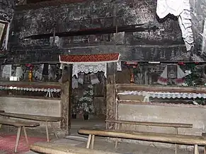 Naosul și parțial altarul, se află sub o interesantă boltă semicilindrică, proporțional mai scundă peste absidă. Bârnele bolții naosului au fost așezate pe una mai solidă, fixată vertical în interior, iar cele ale bolții altarului direct pe pereții paraleli, retrași. Pentru restul ‘cerimii’ absidei, meșterii au utilizat trei triunghiuri sferice, ca și la altarele unor biserici din zonă, dar atât de bine fixate, încât nici după uscarea lemnului nu au apărut fisuri[1].