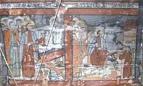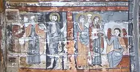 Pronaosul pictat are următoarele reprezentări: Izgonirea din Rai, Corabia lui Noe, Jertfa lui Avraam, fragmente din ceata sfinților, Sfinții Împărați Constantin și Elena, Sfântul Nicolae, Arhanghelul Mihail, Maica Domnului cu Pruncul, Iisus.