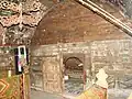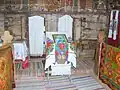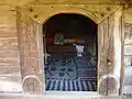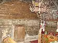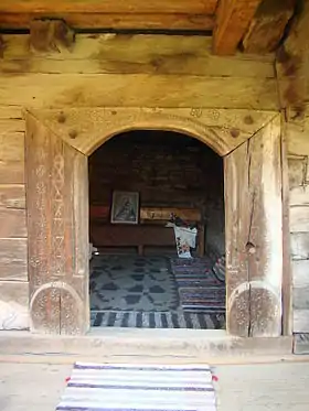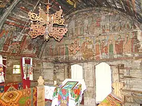Iconostasul este prevăzut doar cu două intrări, un element arhaic. În registrul superior este scena Răstignirii, cu Maria, Maria Magdalena, Ioan, soldați, cei doi tâlhari și un peisaj cu case, și cei patru evangheliști. Cu un registru mai jos este redat Iisus Pantocrator, având în dreapta și stânga Apostolii. Pictura este însoțită de texte în limba română scrise cu caractere chirilice. În naos se mai păstrează un candelabru din lemn, o cruce pictată și icoane pe lemn, între care se remarcă icoana Sfântului Nicolae.[3]