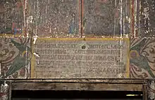 Pisania pictată peste ușile împărătești ne indică o renovare majoră, după cum urmează: „În zilile pria luminatului nostru d[o]mn Barbu Șterbei voivod, sau prenoit de arătaț[i] titori Dinu Mazilu, Ioan Pitia, Sandu Pavel, Popa Vlăduțu, ... Ioan Stănga, Ion Stănil[ă], D[u]mitrie Stănilă, Dinu Stănil[ă], D[u]mitru Braga, Costand[i]n Pitia, Costand[i]n Pitia, Popa Laz[ă]r, Vlăduțu Pitia, Floria St[ăn]g[ă], Radu St[â]ngu, ... Radu ... Marin Stăngă, Gheorghe Ocheșel, Costand[i]n Andrica cu fii”. Pisania pare a fi o continuare a unei pisanii introductive, probabil datată, care astăzi lipsește. Totuși domnia lui Barbu Știrbei fixează renovarea bisericii la mijlocul secolului 19.