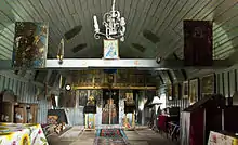 De la vest la est, biserica este împărțită în cele patru încăperi tradiționale: pridvor închis, tindă și naos unite între ele și altar. Altarul este mai îngust și terminat poligonal, în cinci laturi. Trecerea dinspre tindă spre naos este demolată și marcată numai de o grindă tirant, pe care a stat odată pisania. Iconostasul păstrează icoanele vechi împărătești, de o parte și de alta a celor trei uși spre altar. Bolta interioară trece din naos în tindă. Încăperile sunt luminate de un număr redus de ferestre, mult mărite într-o fază ulterioară.