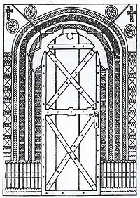 Întrarea în biserică se face pe latura de vest. În fața intrării se află o prispă cu șase stâlpi ce adăpostește intrarea. Spațiul destinat femeilor, pronaosul, este tăvănit, deasupra acestuia fiind amplasat turnul bisericii. Spre turn dar și spre corul ce se află în jumătatea dinspre pronaos a naosului se poate ajunge chiar din prispă urcând o scară. Intrarea în biserică, datorită importanței sale recunoscute, a fost tratată cu maximă atenție. Ancadramentul ușii, rotunjit în partea superioară, are o frumoasă decorație sculptată: cruci, rozete, motivul frânghiei fiind și el prezent. Se presupune că portalul acestei biserici semăna cu portalul bisericii din Stâna.