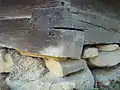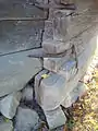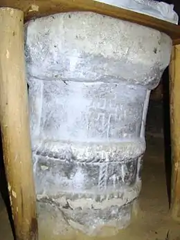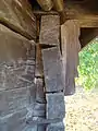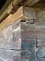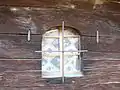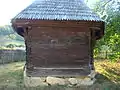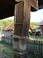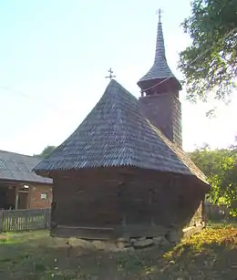 Biserica din lemn, de mici dimensiuni, are un pridvor prevăzut cu o arcadă frontală, sprijinită direct pe patru stâlpi, sculptați în partea superioară, din care se mai păstrează doar trei, cu o deschidere centrală arcuită si două deschideri laterale, fiecare având câte două arce ornamentate cu o linie simplă pe margini, prinse în locuri decupate direct în grindă.