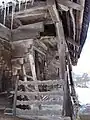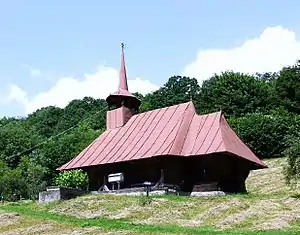 Intrarea în biserică este pe latura sudică pe care se găsește plasat și pridvorul, “simplu, fără parapet, pardosit cu pământ bătătorit... el provine de la casele țărănești și la origine consta dintr-un simplu brâu de pământ bătătorit ocrotit de streașina largă” , data construcției lui corespunde cu cea a bisericii. “Turnul are baza pătrată, cu latura de 1, 47 m. pe aceasta se înalță 4 stâlpi legați câte 2 prin sistemul X al grinzilor de furtună. Deasupra galeriei simple fără arcade se înalță coiful piramidal până la 11, 70 m.” [15] Sfânta Masă, de dimensiuni reduse, este din lemn de stejar cu picior din piatră. Crucea Răstignirii de asemenea este din lemn și are o înălțime de doar 15 cm.