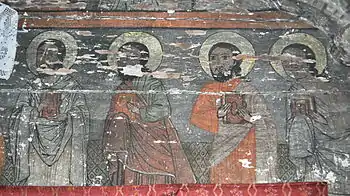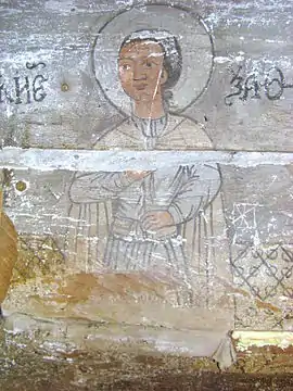 În registrul poalelor bolții naosului apare o friză a sfinților mucenici militari sau făcând parte din cei 40 de Mucenici din Sevastia. În fruntea lor Arhanghelul Mihail ține crucea în mâna stângă și sabia ridicată amenințător în mâna dreaptă. Friza se continuă pe peretele de vest cu doi îngeri care străjuiesc ușa de intrare și se încheie pe peretele de sud cu arhanghelului Gavril. Tema este cu totul neobișnuită pentru bisericile din lemn, se pune probabil în legătură cu condițiile politice și religioase ale vremii perpetuând o sugestie apărută în Moldova în a doua jumătate a secolului al XV-lea, lupta pentru credință își are originea în scena cavalcadei de la Pătrăuți . În pronaos sunt pictate sfintele mucenițe și mironosițe, lipsește însă scena celor 10 fecioare, atât de frecventă în bisericile vechi din lemn din Transilvania. Pictura reprezentând scena Răstignirii având alături scena păcatului este executată pe pânză lipită pe lemn, fără să fie ruptă la încheieturile scândurilor ce o susțin decât pe porțiuni mici și fără continuitate. Tâlharul răstignit de-a dreapta lui Iisus este prins pe cruce într-un mod cu totul neașteptat. Mâinile lui sunt întinse pe brațul orizontal al crucii doar până la încheietura coatelor, aici s-a făcut pironirea – prinderea lor în inele – lăsând antebrațul să atârne. De pe cruce cresc flori de crin cu petale mari, albe. Apariția florilor este semnul ceresc al iertării în urma căinței sale de ultimă clipă. Tâlharul din stânga lui Iisus este răstignit în același chip particular, din crucea lui însă nu cresc flori, dimpotrivă, în urma refuzului căinței capul său este înclinat spre umărul strâng. Alături de scena Răstignirii se desfășoară scena păcatului cu Adam și Eva zugrăviți nud de o parte și de alta a pomului din grădina raiului. Amândoi au trăsături înspăimântătoare, urâțiți de păcat cu privirea plină de teamă datorită sentimentului de vinovăție de care par a fi conștienți. La scenă asistă retras, dar cu mâna întinsă a surprindere arhanghelului Mihail... Dedesubtul scenei Răstignirii se distinge capul lui Isus Arhiereu acoperit cu o mitră episcopală.