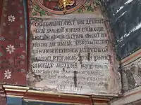 S-au cumpărat acest loc de bisearică de dumnealor jupănu Stoian Hagi Costandin cu soția sa Siriana au făcut și bisearica din temelie au zurgăvit oltariu și fruntariu cu iconele de înpreună sănt ctitori Gherog Laslo, Stoian Ienachie, Sabo Radu, Moldovean Ianuș, Bucură Demeter, Sabo Demeter, Cadar Demeter fiind preot paroh și protopop eparhii Vasi(l)e Pantea, zugrav popa Nicolae, Ban Vasilie, Ano 1814 - aceasta este pisania aflată în dreapta altarului în naos, pisanie din care aflăm numele ctitorilor precum și anul finalizării bisericii.