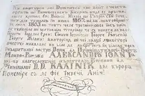 Pisania bisericii: „Cu ajutorul lui Dumnezeu s-au zidit această sfântă și Dumnezeiască biserică, unde se prăznuiește hramul Sf.Voievozi Mihail și Gavril. S-au început din temelie în anul 1862 și au luat sfârșit în anul 1863 cu toate cele trebuincioase însă prin ostenelile și cheltuielile titorilor ce se numesc la vale: Preot Iordache-Ereu, Simeon Iovănescu, Gheorghe Tănăsoiu, Gheorghe Jianu, ajutorând și ceilalți locuitori ai acestei mahalale cu zile de lucru, însă în zilele prea Înălțatului nostru domn al Principatelor Unite Moldo-Române, Alecsandru Ioan I și cu blagoslovenia părintelului Episcop al Râmnicului D.D.Kalinik, ale cărora pomenire să le fie în veci. Amin!”[5]