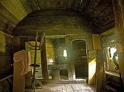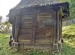 Uștiorii, sau stâlpii, sunt prinși prin cozi în tălponi dedesubt și în grinzi de-asupra, formând o ramă la fiecare perete exterior. Această structură de rezistență este făcută din lemn de stejar. Fundătura de dulapi de brad rigidizează pereții. Dulapii de brad au fost tăiați mecanic, posibil la un gater de apă existent în zonă în urmă cu câteva secole. Însemnările numeroase de pe ei certifică vechimea lor.