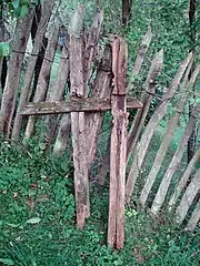 Incinta cimitirului vechi este înconjurată cu gard de pari. Se intră prin partea de jos, printr-o portiță de lemn. În cimitir se mai păstrează două cruci putrede, sprijinite de gard, cu urme de cioplitură decorativă. Frumusețea crucilor făcute de meșterul Aurel din Poienița Tomii se mai poate admira la crucile de casă sau de mormânt ridicate în curțile gospodăriilor din sat.