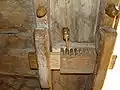 Decorul sculptat: Bârna ce ține loc de cheie de boltă în naos este decorată prin incizie cu motive geometrice. Bolta naosului este traversată de bârne decorate prin cioplire cu motivul valului.