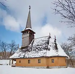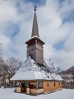 Acoperișul bisericii, din șindrilă, sporește farmecul bisericii. Acesta nu este unitar, deasupra absidei altarului fiind ușor mai scund. Spre vest, deasupra pronaosului se află turnul-clopotniță ce adăpostește clopotele bisericii. Este învelit și acoperit tot cu șindrilă și are galeria turnului deschisă, parapetul acesteia fiind ușor ieșit în afară. Coiful turnului, cu o bază pătrată se prelungește având în a doua sa parte o secțiune octogonală. În vârful turnului, în capătul coamei acoperișului precum și deasupra altarului se află câte o cruce dublă, din metal.