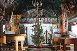 Pictura bisericii a fost refăcută în anii 1985-1986 fiind astfel acoperită pictura inițială a bisericii. Programul iconografic, relativ modest, surprinde în pronaos figurile câtorva sfinți cuvioși: Moise Harapul, Meletie, Maxim, Daniel, Arsenie și Atanasie. Pe peretele despărțitor, tot în pronaos sunt redate în medalioane circulare sfintele: Filoftia, Parascheva și Irina. În naos sunt redați o serie de sfinți cuvioși sau sfinți mucenici: Teodul, Hritodul, Isaia, Gheorghe, Macarie, Varlaam, Ioan Scărarul, Dimitrie. Bolta naosului este împodobită cu scene din viața lui Isus Cristos, cu chipul celor patru evangheliști redați în medalioane circulare în partea superioară a bolții. În centrul ei este redat Isus Cristos binecuvântând, Sfânta Treime și Maica Domnului. Iconostasul are în registrul inferior trei icoane, Sf. Ioan Botezătorul, Maica Domnului și Isus Cristos. Ușile împărătești sunt realizate din lemn traforat și aurit fiind redate elemente vegelate. În centrul fiecărei uși, într-un medalion romboidal este pictat câte un serafim. În registrul superior al iconostasului sunt redații sfinții Apostoli avându-l în centru pe Isus Cristos. Deasupra iconostasului este redată Răstignirea. Timpanul semicilindric care închide bolta naosului spre altar este decorat cu medalioane circulare în care sunt redați prooroci din Vechiul Testament. În absida altarului se regăsesc pictați sfinții părinți: Grigore, Spiridon și Ioan. Timpanul ce închide bolta altarului este împodobit cu scena Cinei cea de Taină iar pe boltă este redată Maica Domnului cu Isus copil în brațe însoțită de îngeri.