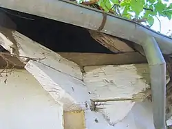 Pe latura de vest există o prispă îngustă, adăugată sau refăcută pe la finele secolului al XIX-lea[6]. Acoperișul, învelit de mai multe decenii în tablă, peste vechea șindrilă, nu este străpuns de clopotniță, care este amplasată în apropiere, cu un parter închis și foișor[7].
