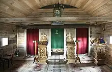 De la vest la est, biserica este împărțită în cele patru încăperi tradiționale: pridvor deschis, de dată recentă, tindă, naos și altar. Altarul este mai îngust și terminat poligonal, în cinci laturi. Pe latura de nord altarul prezintă o mică nișă pentru proscomidie, vizibilă în exterior prin prelungirea peretelui naosului spre răsărit. Trecerea dinspre tindă spre naos este reconstituită, pe locul unor stâlpi de zid secundari. Iconostasul păstrează o grindă originală decorată cu funie peste cele trei uși spre altar. Bolta joasă reproduce forma curbă anterioară. Încăperile sunt luminate de un număr redus de ferestre, mult mărite într-o fază ulterioară.