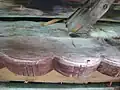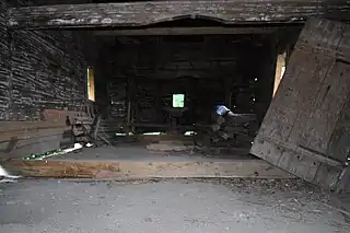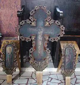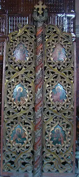 Acoperișul cu învelitoare din șindrilă, unic pentru întregul edificiu, înglobează și volumul bolților, încununat de cruci din fier forjat. Interiorul este reprezentat de icoanele pictate pe lemn, cu scene din viața sfinților, precum și de icoanele împărătești vopsite cu roșu.