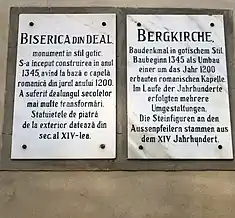 - pe peretele stâng al pridvorului primului portal (cel sudic) scrie: A.D. MCCCCXXIX icepehops, anume A(nno) D(omini) 1429 i(n)cep(tum) e(st) ho(c) op(u)s („În anul Domnului 1429 s-a început această lucrare”)