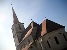 Este construită în secolul al XIV-lea, în stil gotic, cu trei nave, cor și absidă poligonală cu contraforturi. Navele laterale păstrează elemente gotice cu bolți în cruce pe ogive, în timp ce bolta centrală a fost refăcută în stil baroc la 1753, iar corul a fost reconstruit pe vechiul traseu la 1909.