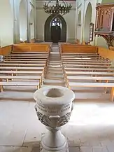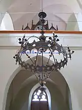 Elemente decorative din interiorul bisericii sunt treptele traforate ale scării amvonului, stranele de pe laturile altarului și cele două candelabre din fier.