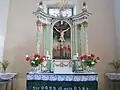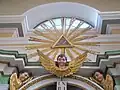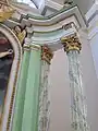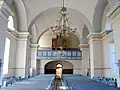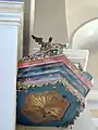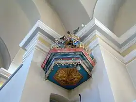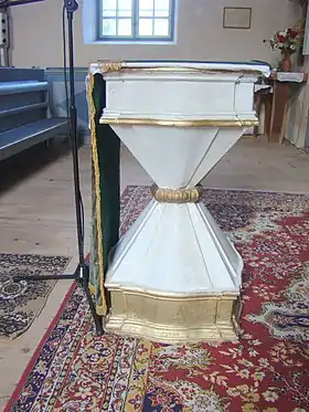 Strana preotului, realizată în stil neoclasic, a fost inițial vopsită în vernil, cu elemente decorate cu foiță de aur. Sub vopseaua actuală păstrează o inscripție de donație a lui Carl von Brukenthal, iar pe o laterală blazonul realizat în basorelief al acestuia.