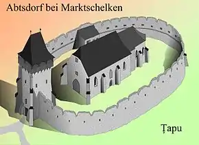 ![]() Biserica fortificată din Țapu ![]() Machetă - Reconstituire pentru bisserica din Ţapu ![]() Planul fortificaţiei din Țapu[2] | |