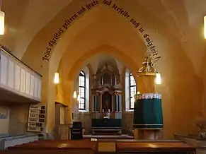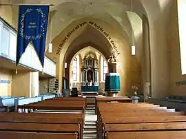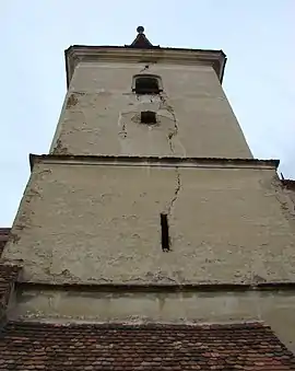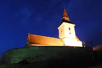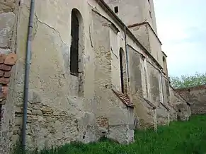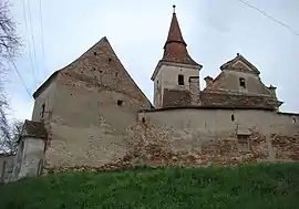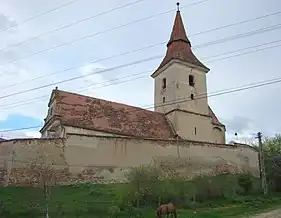 Biserica, ridicată în mijlocul satului la începutul sec. al XIV-lea, a fost o bazilică de factură gotic timpuriu. Ulterior, în etapa de fortificare din secolul al XV-lea, navele laterale au fost demolate, iar arcadele au fost zidite. Deasupra corului a fost ridicat un turn defensiv, iar peste închiderea poligonală au mai fost construite două niveluri de apărare, având contraforții uniți prin arce, iar în spatele acestora au fost practicate guri de aruncare. În 1827, odată cu demolarea sistemelor lui defensive și a catului de apărare al corului, a fost înălțat turnul cu acoperiș piramidal.[6]