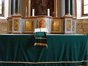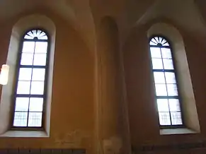 Turnul clopotniță este situat între cor și nava centrală. În turn funcționează trei clopote montate încă în evul mediu, două fiind din secolul al XIV-lea și unul din secolul al XV-lea.[7] Clopotul mic și cel mare, datate în a doua jumătate a secolului al XIV-lea, poartă ambele aceeași inscripție: „O REX GLORIE VENI CUM PACE”.[8] Clopotul mijlociu, datat la începutul secolului al XV-lea, are inscripția „O REX GLORIE VENI NOBIS CUM PACE LEONARDUS”.[9]