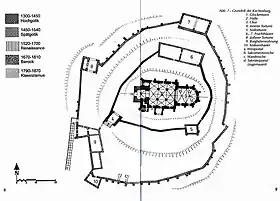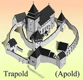 ![]() Biserica fortificată din Apold ![]() Machetă pentru biserica fortificată din Apold ![]() Planul ansamblului fortificat de la Apold | |