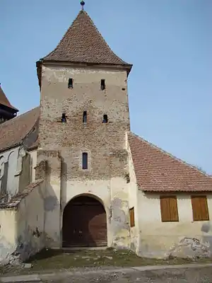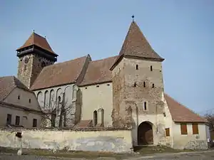 Fortificația ovală din jurul bisericii avea ziduri de apărare înalte de 8 metri, cu drumuri de strajă din lemn, astăzi dispărute, și a fost dublată în nord și în est de o curtină suplimentară. În partea de sud-est a ansamblului fortificat se regăsește turnul-poartă construit cu patru niveluri. El avea prevăzută o hersă ale cărei urme se pot vedea și astăzi pe contraforții laterali ai turnului. Clădirea școlii datând de pe la 1800, se află înglobată în zidul fortificației.[7][6]
