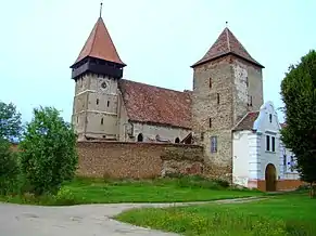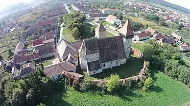 Satul face parte din capitulul Mediaș. Cetatea bisericească este amplasată în partea de nord a străzii lărgite din mijlocul localității. În secolul al XIV-lea a fost construită bazilica gotică timpurie cu hramul sfintei Maria Magdalena. Corul are absidă poligonală 5/8 și o boltă stelară cu nervuri.[4] Pe peretele nord-vestic al corului se păstrează picturi murale, datate 1481. Arcadele dintre nava principală și colateralul sudic sunt demolate, iar zidul de sud supraînălțat, astfel realizându-se o sală a bisericii. În partea de nord se păstrează arcadele cu coloane neprofilate și capiteluri tratate în mod diferit. În fața lor se ridică pilaștrii ce susțin tavanul sălii. Portalul vestic cu o dublă retragere are profilatură compusă din ciubuce și profil pară, precum și o friză de capiteluri cu frunză de viță. Consolele care susțin lintoul portalului sunt decorate cu un portret de bărbat, plastica arhitecturală fiind degradată. În cor se găsește o cristelniță gotică. Altarul neogotic este datat din 1904. Deasupra corului s-a ridicat un nivel fortificat, susținut de arce care leagă contraforturile, înălțate până la nivelul fortificat. Turnul clopotniță a fost prevăzut cu un drum de strajă rezemat pe console de lemn, având deasupra un acoperiș piramidal. Zidul de centură, care astăzi mai are o înălțime de șase metri, este sprijinit parțial de contraforturi exterioare. În sudul cetății se află turnul de poartă cu cinci niveluri și parterul acoperit de o boltă semicilindrică. Părți din incinta fortificată au fost demolate în 1906, construindu-se din materialul rezultat o sală pentru comunitate.[5][6]