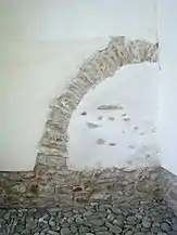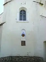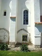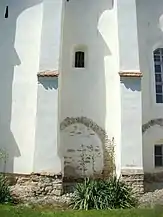 Cea mai veche parte conservată este zona corului cu absida. Se vede că aici contraforții au fost construiți de la început, solidar cu zidul, după cum se obișnuia în cazul absidelor. Pe laturile absidelor se văd urmele a trei ferestre astupate, acoperite cu arc semicircular, dintre care una transformată la exterior în nișă, care începe la 1,15 m de nivelul de călcare. Probabil că aceste ferestre au aparținut fazei originare. În nișa de pe peretele absidal de nord apare data 1548, când se poate considera că ferestrele erau deja astupate.