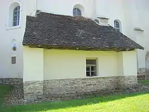 Pe partea de nord a navei spre cor se află o sacristie, ce a fost interpretată ca un rest din vechea navă sau a fost adăugată în cursul secolului XVIII, când funcția de apărare nu mai era esențială.