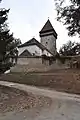 Curtina poligonală ce înconjoară biserica avea prevăzut drum de strajă acoperit perimetral în pupitru. La fiecare din cele patru colțuri se ridica câte un turn de apărare. Intrarea în cadrul incintei se făcea prin parterul turnului nord - vestic, pe latura sudică a curtinei putându-se observa astăzi existența unei poterne. Mai târziu, a fost ridicată o a doua incintă ce avea drum de strajă și două turnuri in colțurile sale libere în partea nordică. O dată cu venirea secolului al XIX-lea s-a demolat o parte a curtinei nordice a incintei exterioare. Aceeași soartă au avut-o și cele două turnuri ale acesteia. Din materialele rezultate s-a ridicat actuala școală. În anul 1968 se prăbușește turnul semicircular sud - estic.[4]