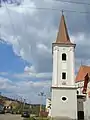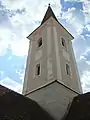 După ce vechea biserică gotică a fost distrusă, s-a construit între 1521 și 1524 edificiul actual. Atât biserica, cât și zidul poligonal de incintă, cu turnuri de apărare la fiecare dintre cele patru colțuri, s-a păstrat în stare destul de bună până astăzi. Turnul de sud a fost înlocuit în anul 1819 cu clopotnița actuală. Biserica sală cu cor poligonal a fost încă din momentul construcției prevăzută cu cat de apărare, dotat cu guri de aruncare între contraforturi.