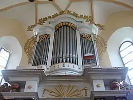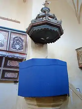 Panourile tribunei din secolul al XVIII-lea, ce mobilează interiorul bisericii pe trei laturi, sunt decorate cu motive florale și picturi reprezentând diferite biserici fortificate. Orga de deasupra altarului a fost montată în 1832 pe structura vechiului altar din 1716. În spatele acestuia s-a păstrat una dintre cele mai vechi inscripții transilvănene: 1524 este anul în care s-au finalizat lucrările de construcție ale bisericii.