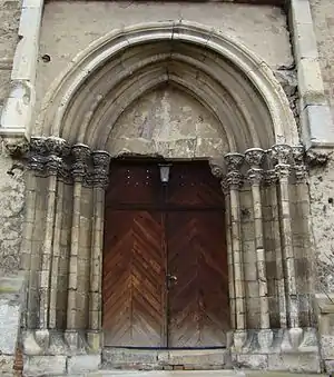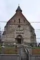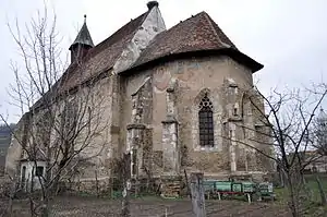În prima jumătate a secolului al XV-lea a fost ridicată biserica-sală. Biserica Evanghelică-Luterană, frumos exemplar de arhitectură gotică târzie, cu o singură navă și cu un cor cu două travee sprijinite de contraforți, a fost construită în stil gotic și este lipsită de turn. În interiorul corului au fost degajate în 1975 picturi în benzi ornamentale și figurile a doi sfinți, pictate la începutul secolului al XVI-lea. Remarcabile sunt ancadramentele ferestrelor, bogat dantelate si fragmentele de pictura murală de pe fațadele corului: scene din patimile lui Isus și Sf. Cristofor, de mari dimensiuni (sec. XVI, înainte de 1544). Relicte ale unor stele funerare romane zidite în pereți, una dintre acestea, reprezentând taurul lui Poseidon a fost la originea unei confuzii cu o posibilă prezență a stemei Moldovei pe pereții bisericii[2].