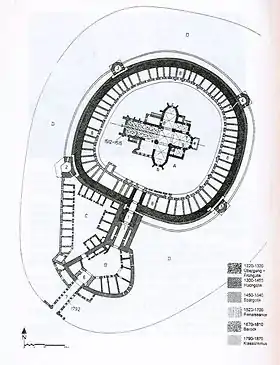![]() Biserica fortificată din Prejmer ![]() Macheta ansamblului fortificaţiei şi a bisericii ![]() Planul bisericii și a fortificației | |