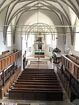 Relativ recent, în secolul al XIX-lea atât bolta navei cât și bolta corului au fost modificate înlocuindu-se bolțile semicilindrice cu penetrații. Ferestrele bisericii sunt în stil gotic târziu prezentând vederii muluri[5] traforate precum și fragmente din rondele de sticlă înglobate într-o rețea de plasă din plumb. Odinioară, orga se afla deasupra altarului. În secolul al XVIII-lea aceasta a fost relocată într-o tribună pe latura vestică, special construită.