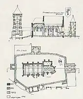 O dată cu acordarea indulgenței papale din 1390 este foarte probabil să fi început construirea bisericii - sală. Biserica este lungă și îngustă, ea fiind înconjurată de zece contraforți ridicați special pentru sprijinirea pereților sălii. De asemenea, colțurile absidei de formă pentagonală sunt întăriți de contraforți. Spațiul lăsat de către doi contraforți ai peretelui nordic al corului a permis construirea unei sacristii boltite ce are două travee cu nervuri de teracotă din care, astăzi, se mai păstrează doar câteva fragmente.