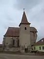 Biserica sală a fost construită în jurul anului 1400, stilul său aparținând din punct de vedere stilistic de goticul târziu. Închis spre partea de est, corul său generos este separat printr-un arc triumfal neobișnuit de înalt, de sală, el fiind iluminat prin intermediul a trei ferestre încheiate cândva în arc frânt. Pe peretele nordic nu există ferestre, în timp ce peretele sudic are trei ferestre înguste în arc frânt. Odinioară, spre apus, fațada deschidea un portal impresionant de circa doi metri înălțime și lat de 1.5 metri, el fiind zidit ulterior. Intrarea în biserică se face pe o singură ușă de acces aflată pe latura sudică, acces ce formează un alt arc frânt ce se profilează evident printr-o tencuială de mortar. Caturile de apărare aveau fiecare șapte metereze, câte două aflate în pereții corului și câte unul pe laturile estice ale absidei. Meterezele au formă dreptunghiulară, destinația lor fiind adresată armelor de foc.