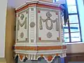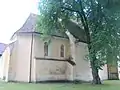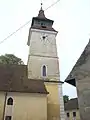 Turnul clopotniță este ridicat în partea de vest la mai bine de un secol distanță (1794), odată cu montarea tribunelor de lemn la interior.