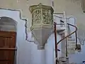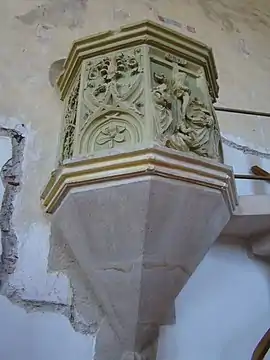 Amvonul gotic din piatră al bisericii (asemănător cu cel de la Biertan din 1524) montat pe latura nordică a navei