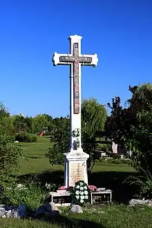 „Crucea aceasta a fost pusă aici în anul 1928 pe locul altarului bisericii ortodoxe române demolate în anul 1913”