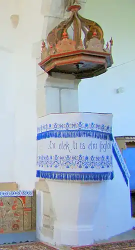 Interiorul bisericii este dotat cu mobilier unitar de lemn pictat. Cele cinci tăblii din zona centrală a parapetului galeriei sunt decorate în stilul familiei de pictori Umling, reprezentând compoziții vegetale cu rodie, ghindă, lalea și alte flori. Parapetul de la strane și primele bănci are tăblii în formă dreptunghiulară, cu colțuri teșite sau dreptunghiuri prelungite cu triunghiuri, care sunt decorate cu motive ornamentale libere, de vrejuri și flori. Dulapul orgii este lucrarea lui Lőrintz Umling tatăl, are suprafața pictată în imitație de marmură, iar la partea superioară se încheie cu un cap înaripat de înger.