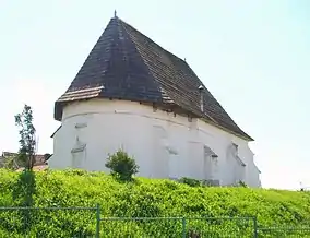 Géza Entz o datează din a doua jumătate a secolului al XIII-lea, când a fost construită o biserică cu o singură navă, relativ mică (748 x 573 x 770 cm). Ferestrele înguste ale navei cu absidă semicirculară, separate de un arc de triumf, sunt semicirculare. Mai târziu, conform planurilor lui László Debreczeni, ferestrele au fost lărgite. Tavanul plat realizat în 1721, este format din 48 de panouri din lemn, vopsite cu decorațiuni geometrice. Inscripțiile casetelor sunt: „HOC/TABU […] MEZ (?)/ERECTUM EST/ANNO DOMINI/1752/IUN.27”, respectiv „CURATOR/D. SIGISMUNDUS/VEREBELI (?) AEDITUI/ D. GABRILE GAAL/STEPH. TŐREK.”