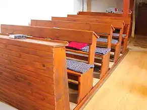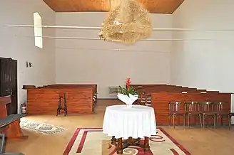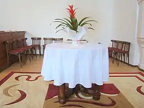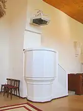 Inscripția de pe coroana amvonului: „Slavă lui Dumnezeu, realizată de Károly H. Bakó și soția sa D. Emilia D. Daday mai 1890. 25“.