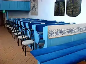 Interiorul bisericii este amenajat cu mobilier bisericesc obișnuit și este dominat de o culoare albastră care acoperă aproape tot: băncile cu decor sculptat, tribunele cu parapet casetat, ușile, orga și tavanul casetat al navei. Din tribuna de la capătul vestic al navei se deschide accesul spre etajele turnului. Tavanul navei are 8 x 12 casete, care sunt decorate cu câte o stea în centru. Pe cele patru casete centrale s-a montat o casetă-ladă, pe care cu ocazia zugrăvirii planșeului în albastru, în aul 1982, s-a fixat o placă cu textul copiat al inscripției originale. Din această inscripție aflăm, că tavanul a fost realizat din donația lui Sándor Kovásznai în 1782, în timpul pastorului Zsigmond Barta.