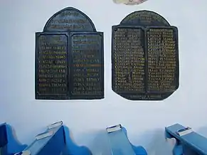 În biserică se găsesc mai multe piese funerare nobiliare. Pe parapetul tribunei sunt fixate trei blazoane funerare, cel mai timpuriu fiind cel al lui Gergely Inczédi din 1810. În cor se află două monumente funerare (de fapt pietre funerare inițial amplasate în podea, ulterior înzidite în perete): în peretele sudic cel al comanditarului tavanului, János Gáspár de Șuveica, având în partea superioară blazonul lui cu unicorn (1625), iar în peretele estic o altă piatră funerară, dar cu textul aproape dispărut, care se presupune că a fost ridicată de Kata Safarit (Sapahrit) pentru primul său soț, János Lázár IV., decedat înaintea anului 1607. Deasupra arcului de triumf se află monumentul funerar din marmură neagră al lui József Lázár, ridicat în 1841 de către soția sa, Zsuzsanna Intzédi. În navă se găsesc două monumente funerare, pe peretele arcului de triumf: cel al lui Kata Teleki din 1758, amplasat de soțul ei, János Lázár, iar pe peretele nordic cel al lui György Lázár, decedat în 1660, piatra fiind comandată în 1666 de către fiul lui, Imre.