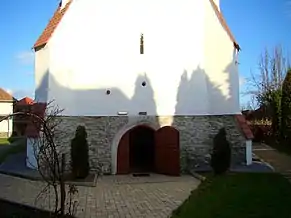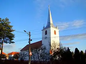 Biserica este situată în mijlocul localității, lângă strada Principală. În curtea bisericii se intră prin poarta de la începutul secolului al XIX-lea, cu stâlpi zidiți purtând sfere de piatră, pe unul dintre batanții din fier forjat apare și monograma donatorului, G L J (gróf Lázár József). Organizarea spațială a bisericii este cea tradițională: turn zidit la vest, navă și cor poligonal. La sud de navă se află un portic datând de la începutul secolului al XIX-lea. Pe baza analogiilor, corul mai lung decât nava și de o lățime aproape identică cu aceasta, indică lărgirea acestuia în evul mediu târziu. Turnul, nava și corul se sprijină pe contraforturi, pe latura sudică a navei fiind un contrafort în plus față de cea nordică. Lipsa contrafortului de pe peretele nordic al corului indică locul sacristiei demolate, fiind vizibile și amprentele bolții medievale pe peretele corului. Aspectul exterior medieval s-a păstrat cel mai bine în cazul turnului: o construcție masivă, cu guri de tragere și un coif cu patru turnulețe de colț. Intrarea turnului este ogivală, ancadramentul de piatră fiind probabil sub tencuială. Nava are două, iar corul trei ferestre mari, cu închidere semicirculară.